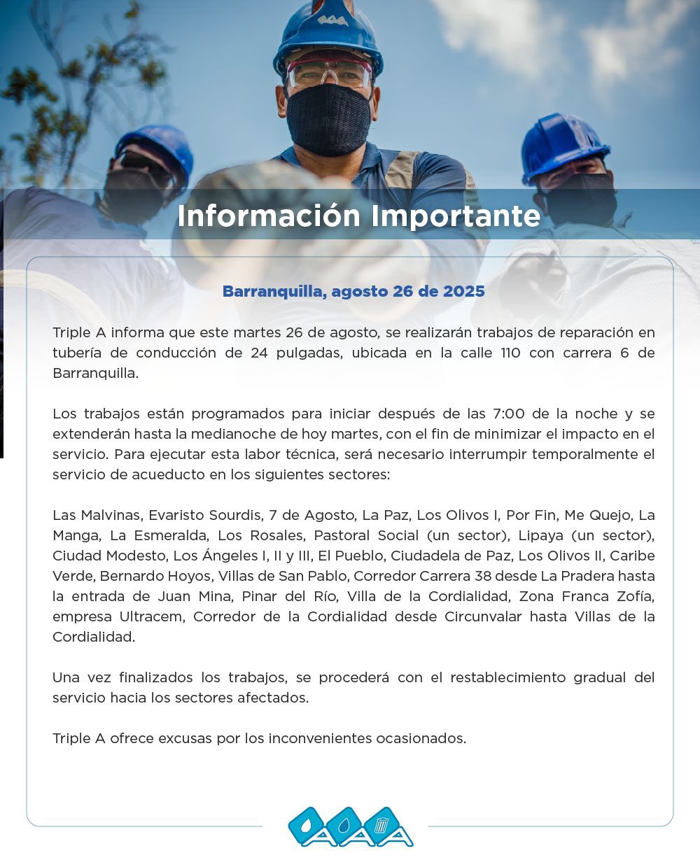 La empresa de servicios públicos Triple A informó que este martes se llevarán a cabo trabajos de reparación en una tubería de conducción de 24 pulgadas, ubicada en la calle 110 con carrera 6. Los trabajos están programados para comenzar después de las 7:00 de la noche y se extenderán hasta la medianoche, con el […]