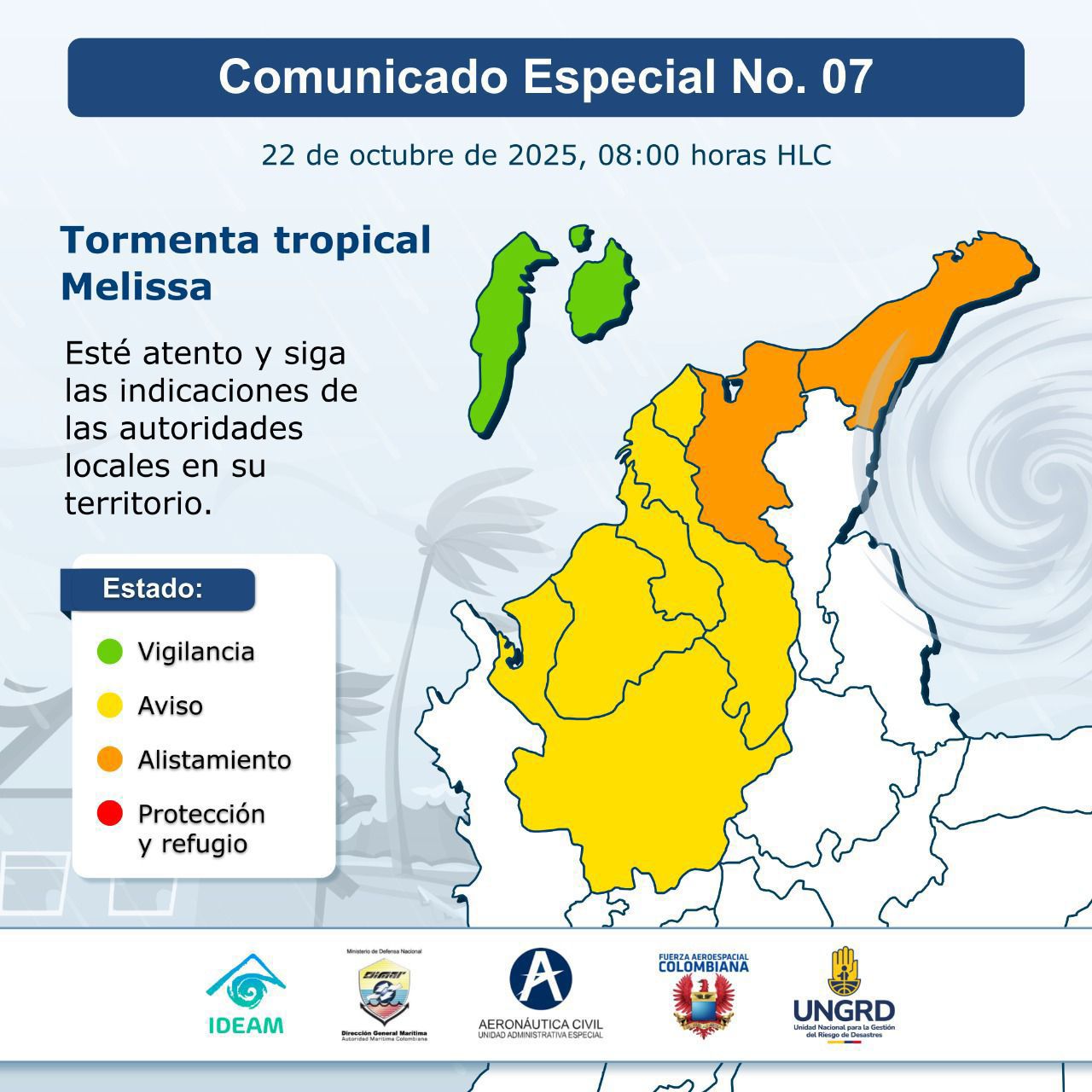 La Mesa Técnica de Alertas de Ciclones Tropicales (MTACT) emitió el más reciente comunicado sobre la Tormenta Tropical Melissa, reiterando que el sistema continúa su avance en el mar Caribe y mantiene activo el Protocolo Nacional de Alerta por Ciclones Tropicales en Colombia. Según el informe, se mantiene el estado de Alistamiento para los departamentos […]