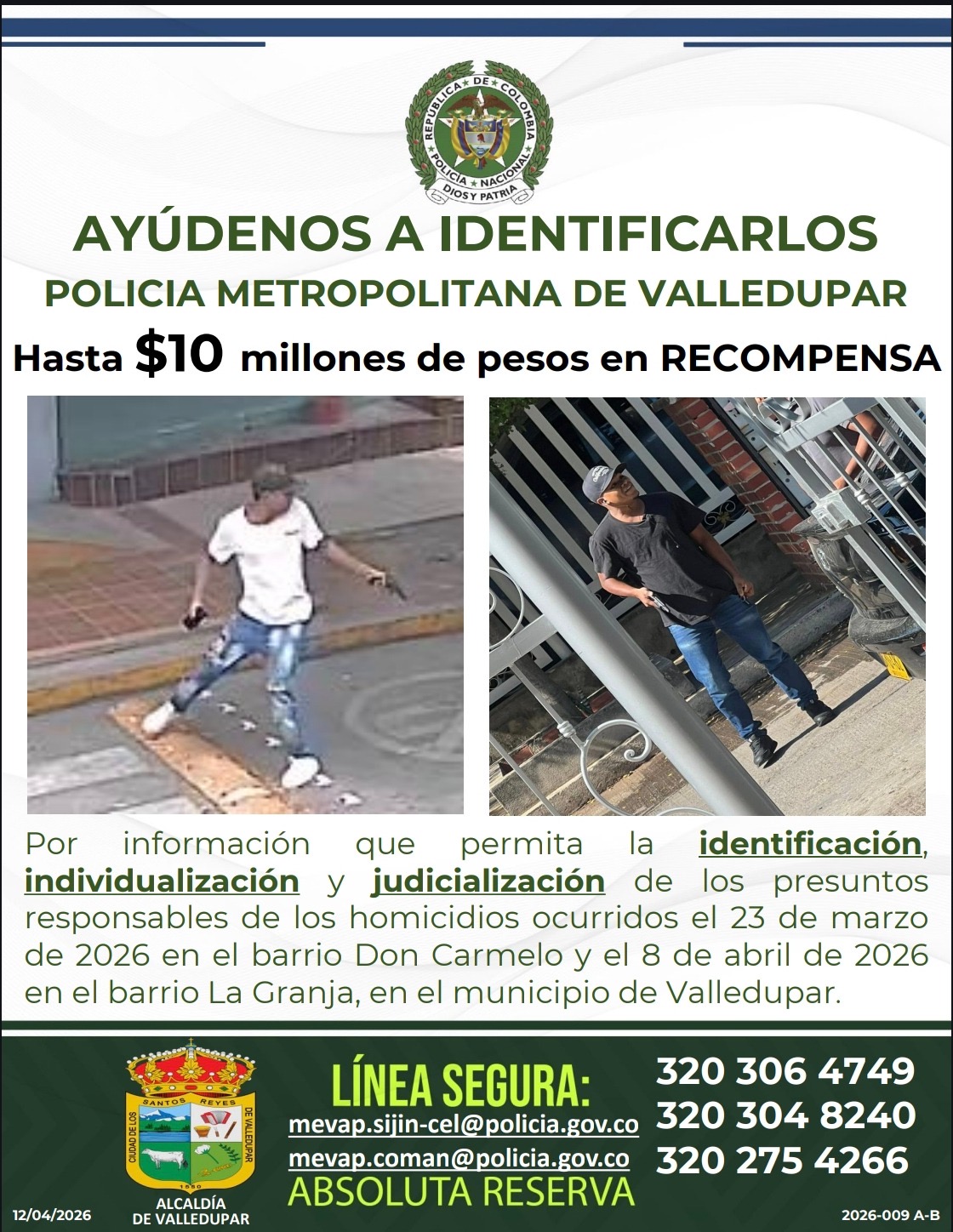 La Policía Metropolitana de Valledupar, en coordinación con la Alcaldía Municipal, anunció el pago de una recompensa de hasta 10 millones de pesos a quien suministre información que permita identificar y capturar a los responsables de dos homicidios ocurridos recientemente en la ciudad. Los hechos, registrados en los barrios Don Carmelo y La Granja, estarían […]