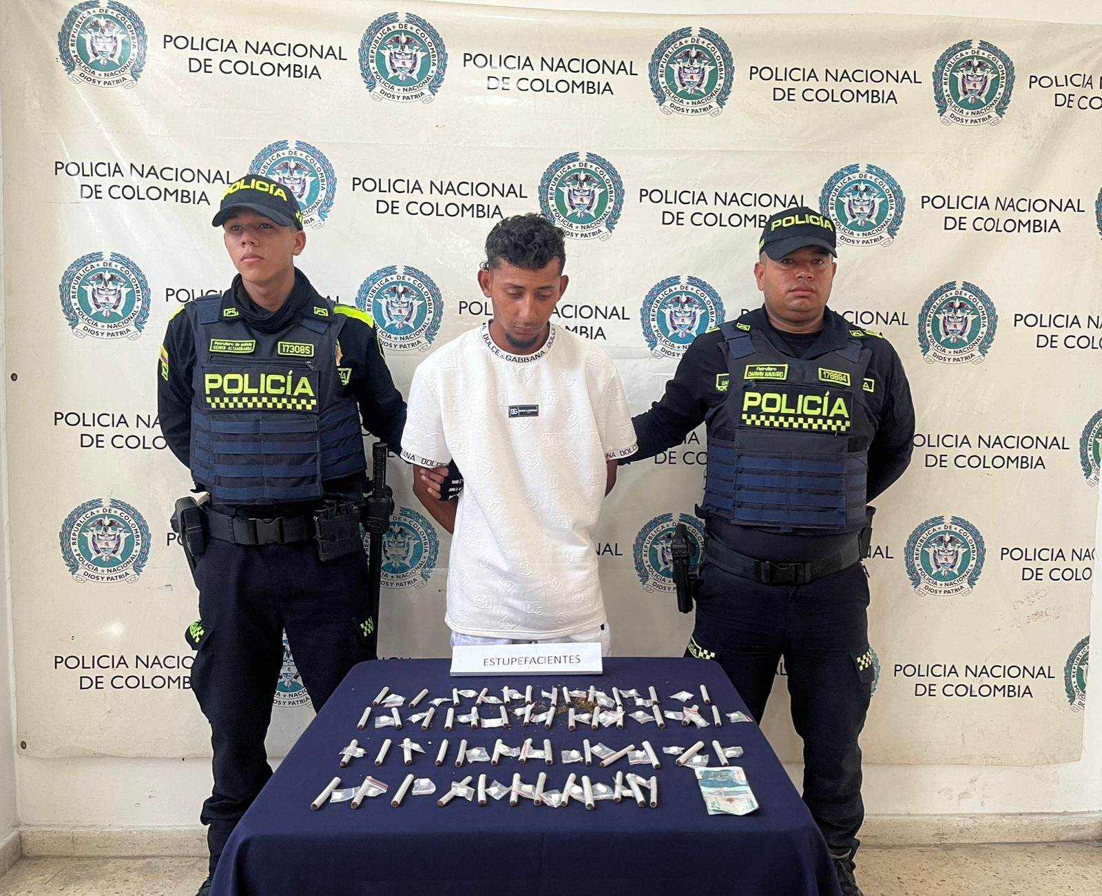 Los hechos ocurrieron cuando, en medio de labores preventivas sobre la calle 22 con carrera 1A, los uniformados abordaron a un sujeto que mostraba una actitud sospechosa. Al momento de realizarle un registro, se le encontró en el bolsillo del pantalón una bolsa plástica que contenía 51 cigarrillos artesanales con una sustancia vegetal de color verde, con características similares a la marihuana. Además, se hallaron 49 bolsas plásticas transparentes con una sustancia pulverulenta, al parecer base de coca.