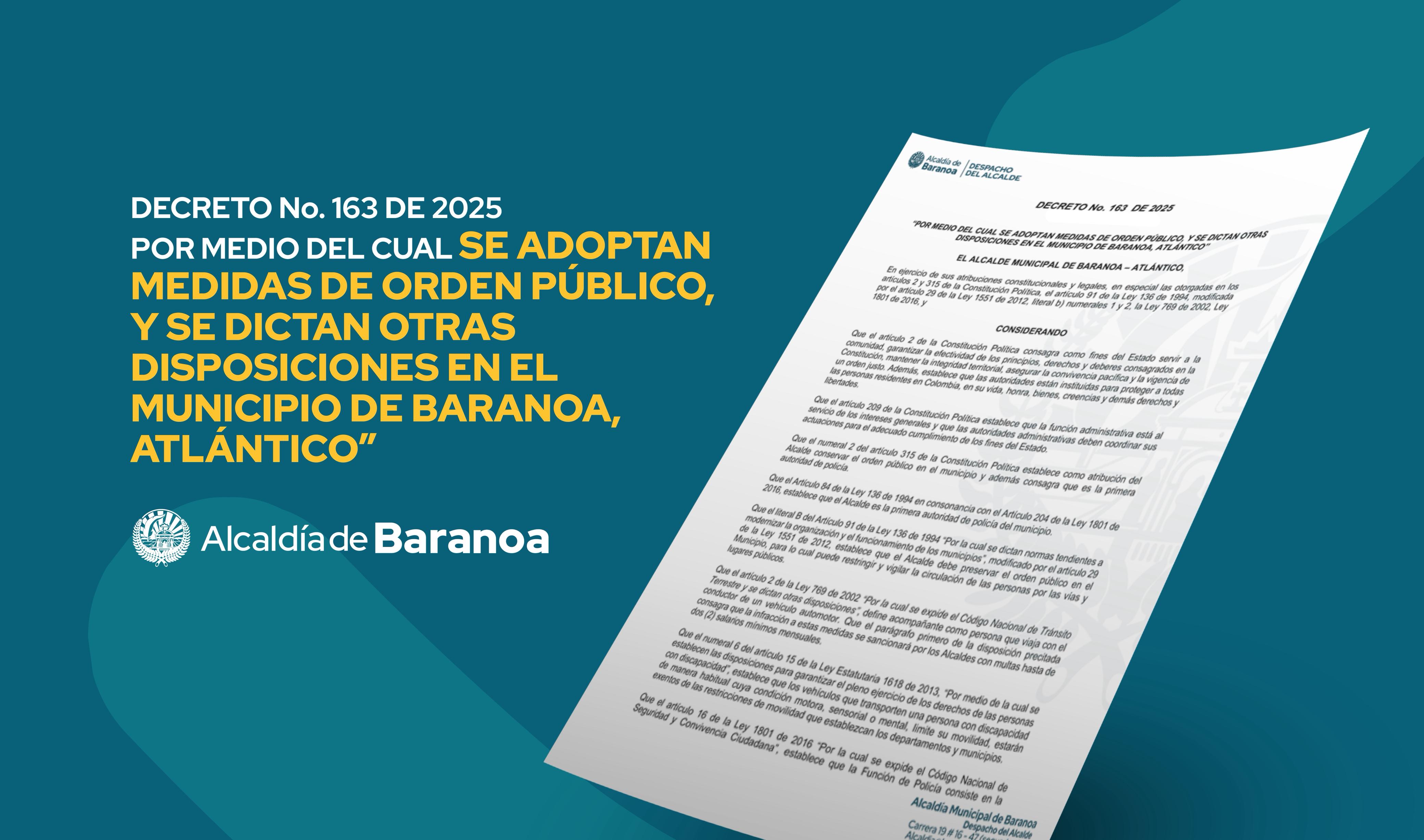 El alcalde de Baranoa, Edinson Palma, expidió el Decreto 163 del 25 de septiembre de 2025, estableciendo una serie de medidas temporales y preventivas para contrarrestar los recientes hechos que han afectado la seguridad y la convivencia ciudadana en el municipio. Estas disposiciones, vigentes entre el 27 de septiembre y el 30 de octubre de 2025, buscan proteger la vida y la tranquilidad de los habitantes.