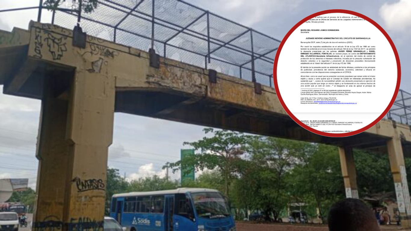 El puente peatonal ubicado en la calle 30, entre el colegio INEM y el ITIDA, continúa generando preocupación por su avanzado estado de deterioro. Ante el riesgo que representa para estudiantes y transeúntes, el Juzgado Noveno Administrativo del Circuito de Barranquilla admitió una acción popular interpuesta por líderes y padres de familia del sector.