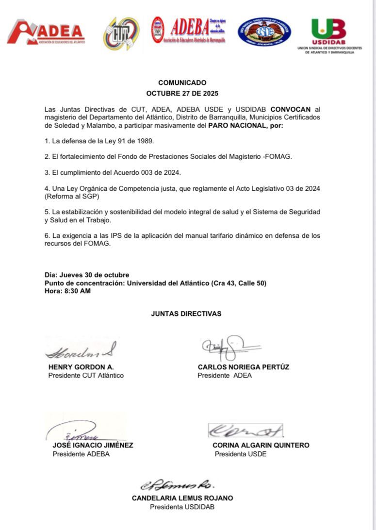 Las organizaciones sindicales que representan al magisterio en el departamento del Atlántico, incluyendo la CUT, ADEA, ADEBA, USDE y USDIDAB, han convocado a una masiva participación en el Paro Nacional programado para el próximo jueves 30 de octubre. El movimiento busca la defensa de las conquistas gremiales y la mejora en las condiciones de salud y seguridad social de los docentes.