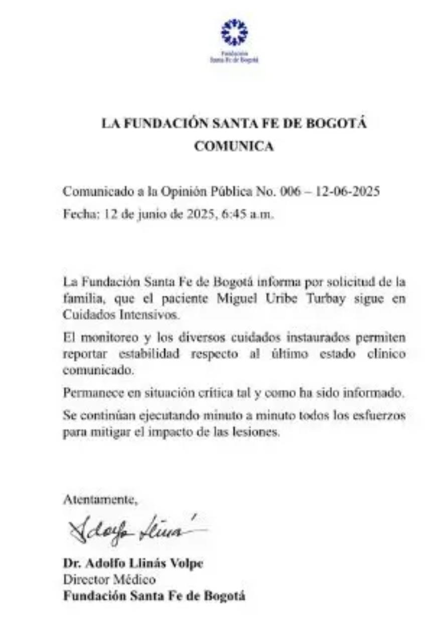 La Fundación Santa Fe de Bogotá emitió un comunicado este 12 de junio de 2025, a las 6:45 a.m., informando que el paciente Miguel Uribe Turbay continúa internado en la unidad de Cuidados Intensivos.
