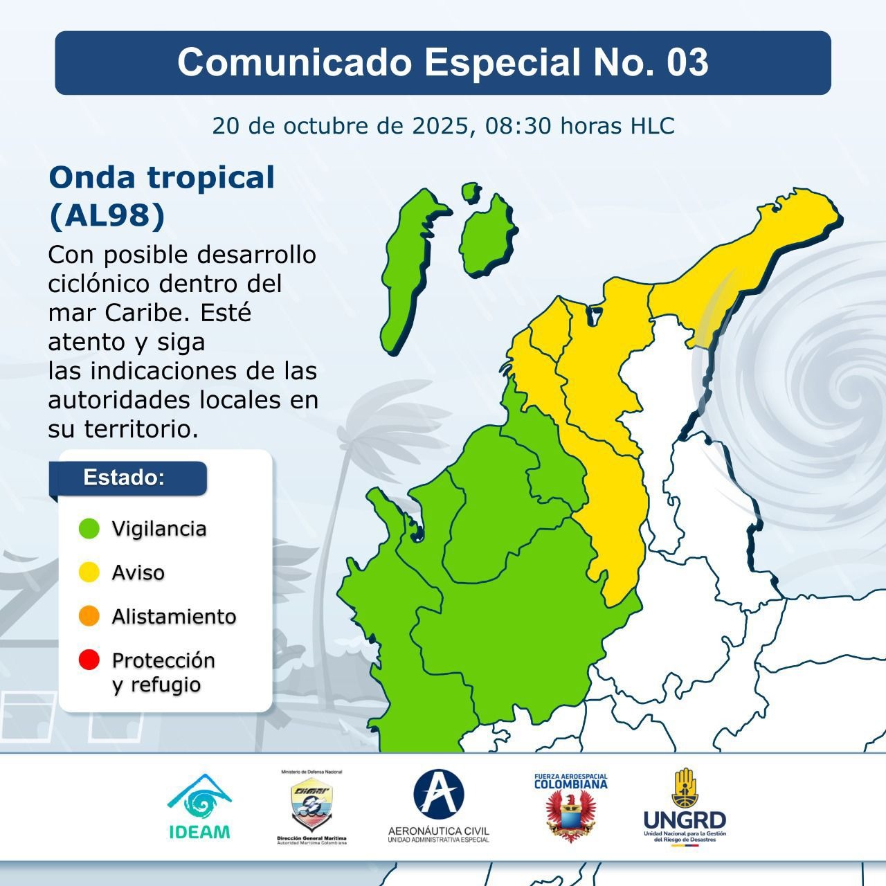 El gobierno colombiano emitió un Boletín Especial sobre la Onda Tropical AL98, que se desplaza sobre el este del Mar Caribe y presenta una alta probabilidad de intensificarse a ciclón tropical, afectando potencialmente la región Caribe de Colombia.